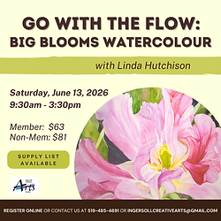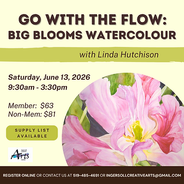 Ready for the next step in your watercolour journey? Join us for a full day’s exploration of flowers—on a big scale. Big, as in quarter sheet (11” x 15”) or even, daringly, a half sheet (15” x 22”). Daunting as this may sound, you are not venturing alone. I will guide you at each step as you meet the challenge to expand basic skills and study the magic of water in the medium. Wonder and delight await you as you learn to “go with the flow” through both wet on wet and wet on dry techniques. (Previous experience with watercolour is recommended.) Colour reference pictures will be available for ideas as well as some enlarged flowers for tracing. Members: $63 Non-members: $81 Paper will be supplied. Additional supply list will be provided to participants.